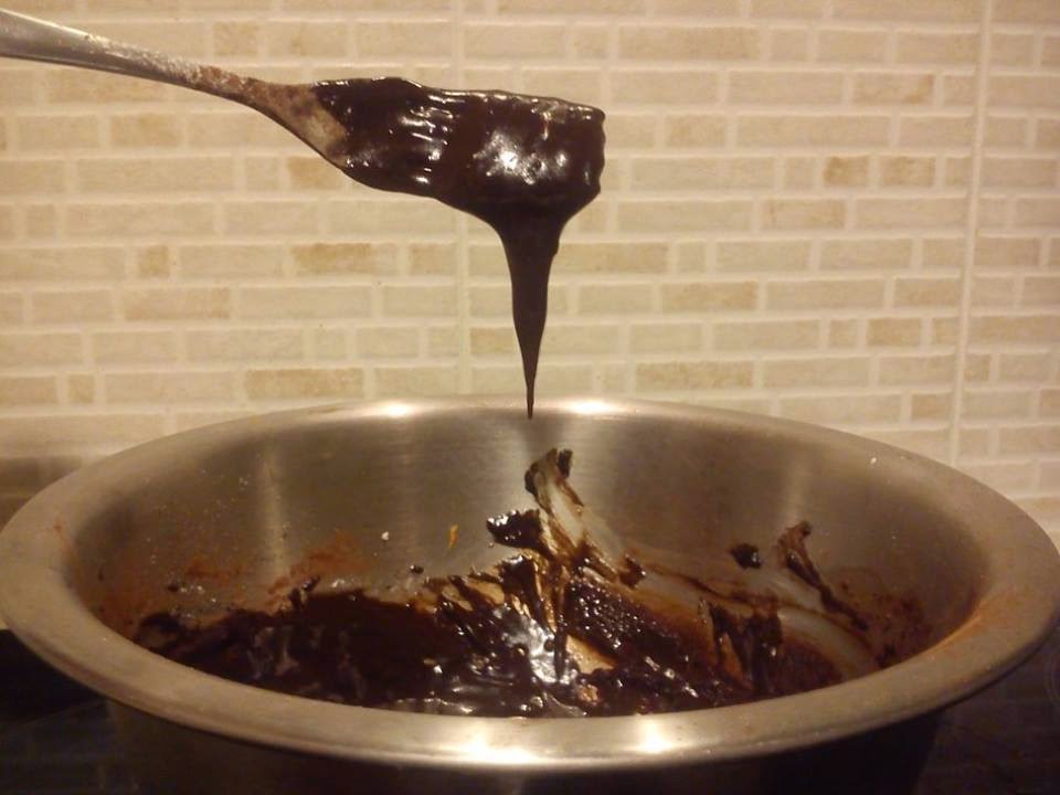 Mix well olive oil with sugar and cocoa, put the aromatic ingredients then add the water/milk